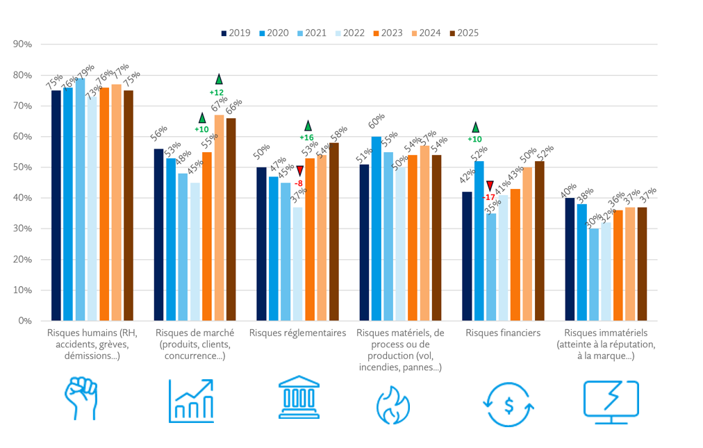 Le top 3 des risques rencontrés par les dirigeants reste stable. Les risques humains arrivent toujours en tête (75 %). Viennent ensuite les risques de marché (66 %), puis les risques réglementaires (58 %), en forte hausse (+21 points en 3 ans). Cette progression traduit la complexification du cadre réglementaire et normatif qui pèse de plus en plus dans le quotidien des dirigeants, tant en matière d’organisation que de coûts de mise en conformité.